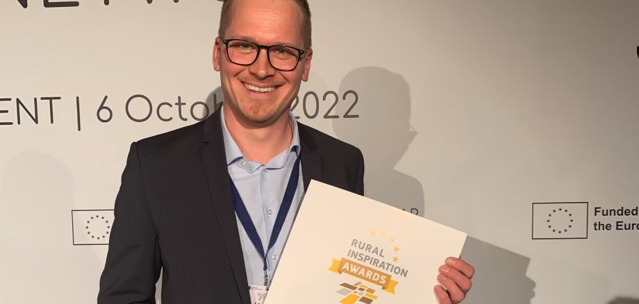 Der Regionalmanager Matthias Wagner aus dem Leipziger Muldenland hat die Auszeichnung in Brüssel stellvertretend für alle beteiligten Akteure aus den LEADER-Regionen in Empfang genommen.